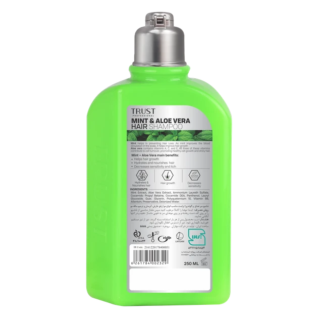 رفع خارش پوست سر آبرسان مو و پوست سر ترمیمکننده ساقه مو فاقد سدیم لوریل سولفات فاقد پارابن مناسب انواع م مواد موثره عصاره نعناع، عصاره آلوئهورا، آمونیوم لورت سولفات، کوکامیدوپروپیل بتائین، کوکامید DEA، پانتنول، لوریل گلوکوزید، گوار، گلیسیرین، پلی کواترنیوم-10، ویتامین B6، آلانتوئین، نگهدارنده، آب دیونیزه