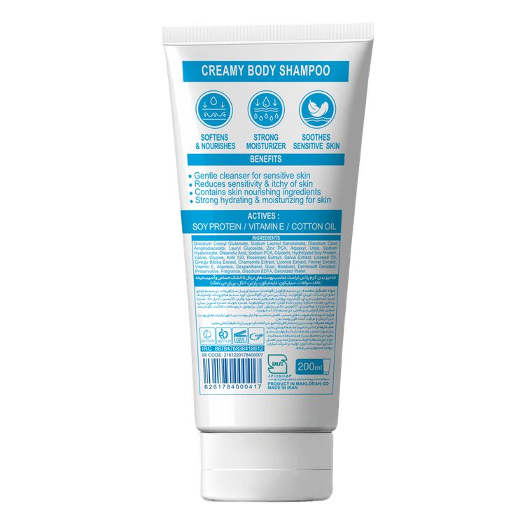 شوينده ملايم حاوي ١٠٪ كرم مغذي، نرمكننده، آبرسان و مرطوبكننده قوی ضدخارش، ضدالتهاب و التيامبخش مناسب پوستهاي خشك و حساس فاقد سولفات، سیلیکون، دایمتیکون، پارابن، الکل، پی ای جی و نمک