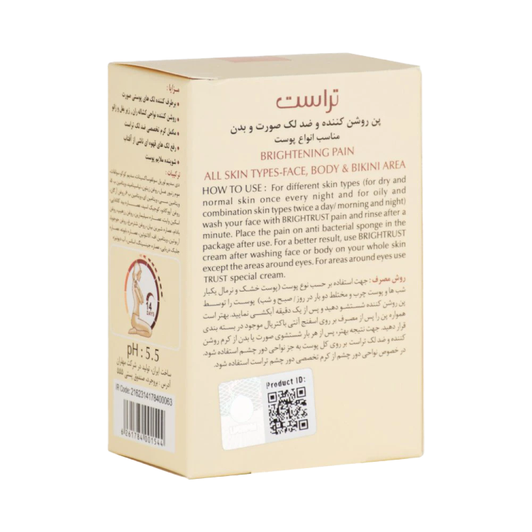 پاككننده عميق پوست روشن، شفاف و جوانكننده پوست كمك به درمان لكهاي پوستي ناشي از آفتابسوختگي، بارداري، افزايش سن و… رفع تيرگي كشاله ران، زير بغل، زانو و… فاقد مواد قليايي و تنظيم pH پوست (Soap-Free) مناسب هر نوع پوست (صورت و بدن) نوع عصاره موم زنبور عسل، روغن زیتون، روغن آرگان، روغن آووكادو، بید كانادایی، سیلیمارین، رزهیپ، روغن بادام، روغن شترمرغ، شیرین بیان، روغن جوجوبا، بابونه، جلبك دریایی، جینسینگ